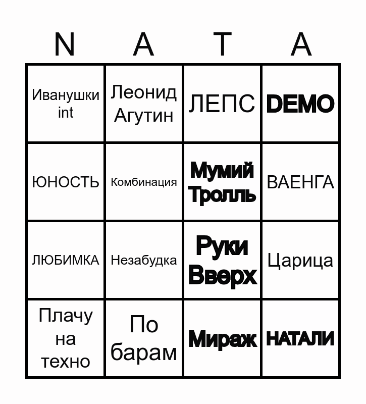 This bingo card has 16 words: По барам, Царица, ЛЕПС, Иванушки int, ЛЮБИМКА, Леонид Агутин, Руки Вверх, Мираж, ЮНОСТЬ, Комбинация, Плачу на техно, DEMO, Незабудка, ВАЕНГА, Мумий Тролль and НАТАЛИ.