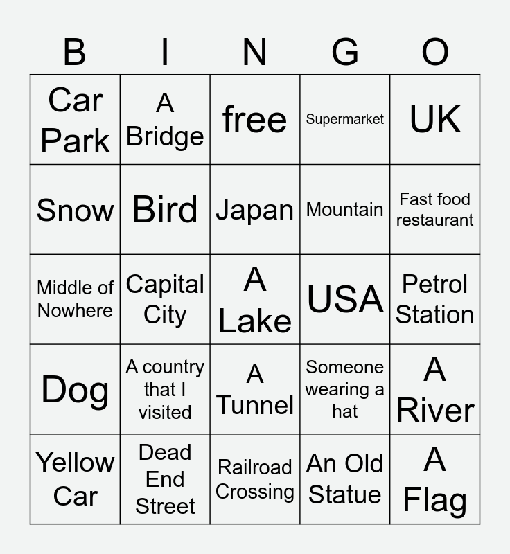 This bingo card has a free space and 24 words: Yellow Car, A country that I visited, Japan, An Old Statue, UK, Car Park, A Bridge, free, USA, Petrol Station, Middle of Nowhere, Bird, Someone wearing a hat, A River, Snow, Dead End Street, Railroad Crossing, Supermarket, Fast food restaurant, Dog, Capital City, A Tunnel, Mountain and A Flag.