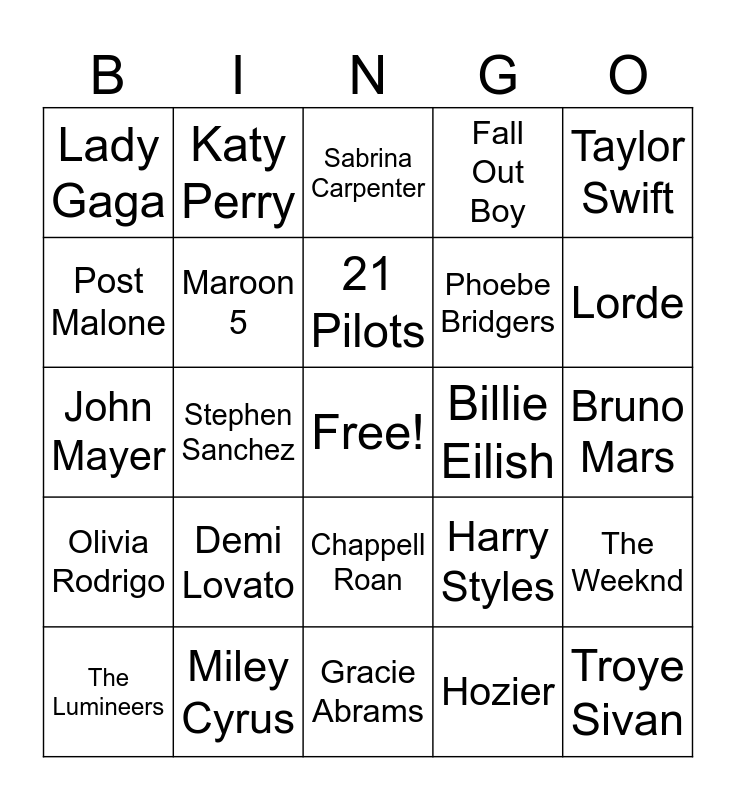 This bingo card has a free space and 34 words: Doja Cat, Hozier, Walk the Moon, Imagine Dragons, Olivia Rodrigo, Maroon 5, Taylor Swift, The Lumineers, Katy Perry, Sza, 21 Pilots, Sabrina Carpenter, Paramore, Mehgan Trainer, Billie Eilish, Lorde, Miley Cyrus, John Mayer, Demi Lovato, Harry Styles, Chappell Roan, Dua Lipa, Lady Gaga, Bruno Mars, Gracie Abrams, Troye Sivan, Fall Out Boy, Selena Gomez, Phoebe Bridgers, Post Malone, Ariana Grande, Stephen Sanchez, The Weeknd and Shawn Mendes.