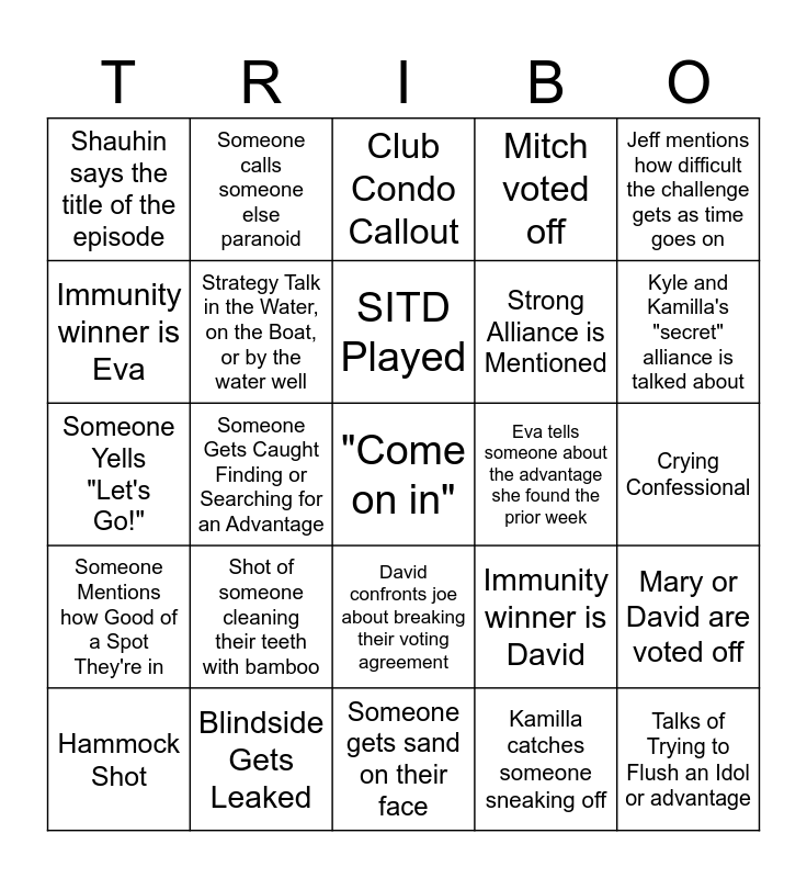 This bingo card has a free space and 27 words: Immunity winner is David, Someone goes on Journey, Strong Alliance is Mentioned, Someone gets sand on their face, Immunity winner is Eva, Club Condo Callout, Someone calls someone else paranoid, Someone Mentions how Good of a Spot They're in, Eva tells someone about the advantage she found the prior week, Mary or David are voted off, Someone Yells "Let's Go!", Mitch voted off, Hammock Shot, Blindside Gets Leaked, Kyle and Kamilla's "secret" alliance is talked about, Someone is Mentioned as a "Physical" or "Immunity" Threat, Strategy Talk in the Water, on the Boat, or by the water well, SITD Played, Shot of someone cleaning their teeth with bamboo, Shauhin says the title of the episode, Crying Confessional, Kamilla catches someone sneaking off, Someone Gets Caught Finding or Searching for an Advantage, Talks of Trying to Flush an Idol or advantage, David confronts joe about breaking their voting agreement, Jeff mentions how difficult the challenge gets as time goes on and Tribe bonding moment.