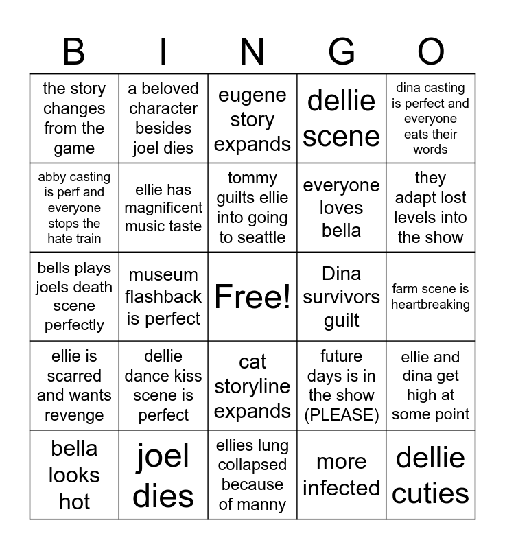 This bingo card has a free space and 24 words: dellie dance kiss scene is perfect, joel dies, tommy guilts ellie into going to seattle, bella looks hot, dina casting is perfect and everyone eats their words, the story changes from the game, abby casting is perf and everyone stops the hate train, a beloved character besides joel dies, Dina survivors guilt, cat storyline expands, everyone loves bella, bells plays joels death scene perfectly, future days is in the show (PLEASE), ellie and dina get high at some point, ellie has magnificent music taste, more infected, farm scene is heartbreaking, eugene story expands, they adapt lost levels into the show, museum flashback is perfect, dellie cuties, ellie is scarred and wants revenge, dellie scene and ellies lung collapsed because of manny.