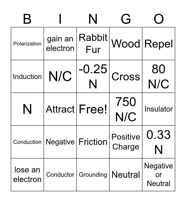 This bingo card has a free space and 24 words: Negative, Conductor, -0.25 N, lose an electron, Repel, Polarization, Induction, gain an electron, 750 N/C, Friction, Cross, N, Positive Charge, 0.33 N, N/C, Neutral, Insulator, Rabbit Fur, 80 N/C, Attract, Negative or Neutral, Conduction, Wood and Grounding.