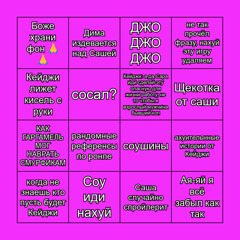 This bingo card has 16 words: Соу иди нахуй, ахуительнные истории от Кейджи, ДЖО ДЖО ДЖО, Боже храни фон 🙏🙏, КАК ГАРГАМЕЛЬ МОГ НАВРАТЬ СМУРФИКАМ, Дима издевается над Сашей, соушины, Саша случайно спройлерит, Кейджи лижет кисель с руки, сосал?, когда не знаешь кто пусть будет Кейджи, не так прочёл фразу, нахуй эту игру удаляем, рандомные референсы по ронпе, Щекотка от саши, Кейджи: а да Сара иди сделай эту опасную для жизни работу, не то чтобы я взрослый мужчина бывший коп and Ая-яй я всё забыл как так.