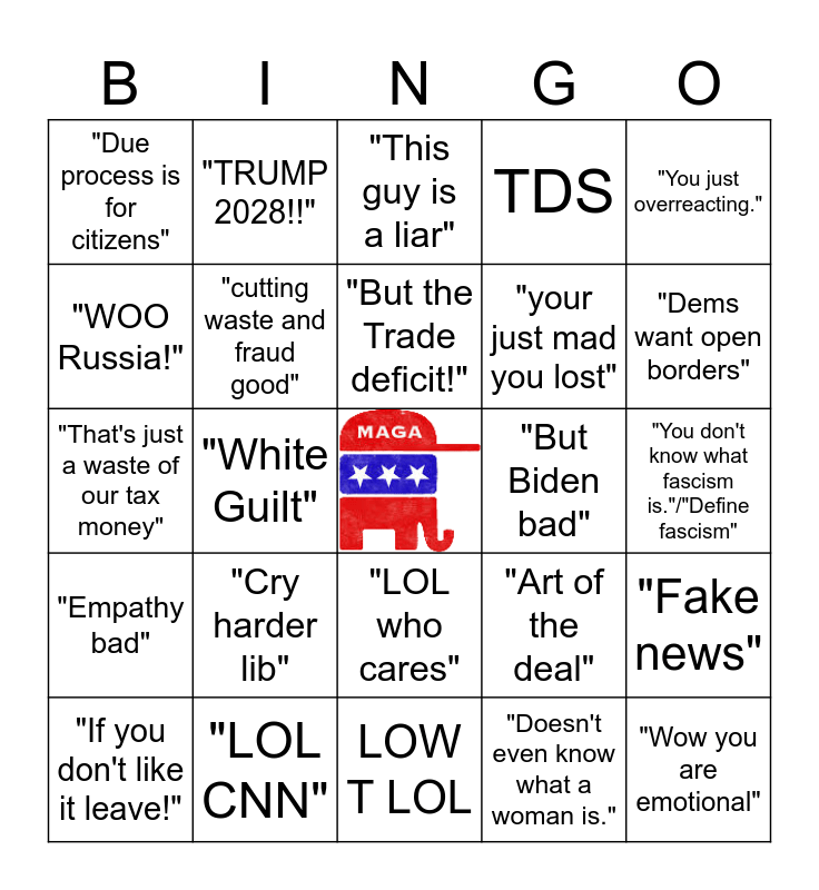 This bingo card has a free space and 24 words: "Cry harder lib", "LOL CNN", "But the Trade deficit!", "If you don't like it leave!", "You just overreacting.", "Due process is for citizens", "WOO Russia!", "TRUMP 2028!!", "But Biden bad", "LOL who cares", "your just mad you lost", "That's just a waste of our tax money", "Art of the deal", "Fake news", "cutting waste and fraud good", "Doesn't even know what a woman is.", "You don't know what fascism is."/"Define fascism", "This guy is a liar", "Dems want open borders", "White Guilt", "Wow you are emotional", "Empathy bad", TDS and LOW T LOL.