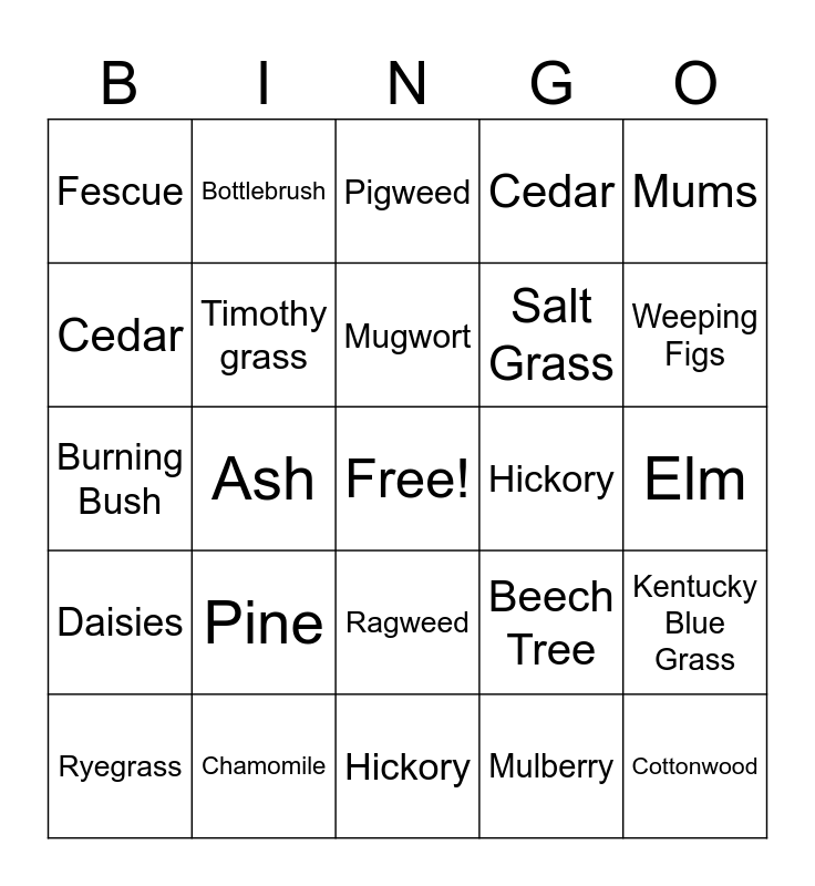 This bingo card has a free space and 39 words: Birch, Maple, Oak, Timothy grass, Ryegrass, Ragweed, Mugwort, Sagebrush, Mums, Daisies, Ash, Cedar, Cottonwood, Elm, Hickory, Pine, Willow, Fescue, Sweet Vernal, Beech Tree, Cedar, Hickory, Salt Grass, Weeping Figs, Yucca, Corn plants, Burmuda Grass, Juniper, Russian Thistle, Bottlebrush, Box elder, White Goosefoot, Pigweed, Chamomile, Mulberry, Alder, Kentucky Blue Grass, Burning Bush and Tumbleweed.