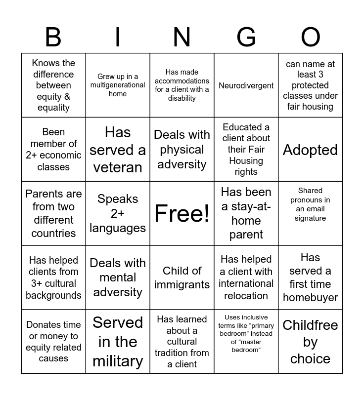 This bingo card has a free space and 24 words: Deals with mental adversity, Served in the military, Deals with physical adversity, Donates time or money to equity related causes, can name at least 3 protected classes under fair housing, Knows the difference between equity & equality, Been member of 2+ economic classes, Grew up in a multigenerational home, Has been a stay-at-home parent, Child of immigrants, Educated a client about their Fair Housing rights, Parents are from two different countries, Has helped a client with international relocation, Has served a first time homebuyer, Has served a veteran, Uses inclusive terms like “primary bedroom” instead of “master bedroom”, Shared pronouns in an email signature, Has made accommodations for a client with a disability, Adopted, Speaks 2+ languages, Childfree by choice, Has helped clients from 3+ cultural backgrounds, Neurodivergent and Has learned about a cultural tradition from a client.