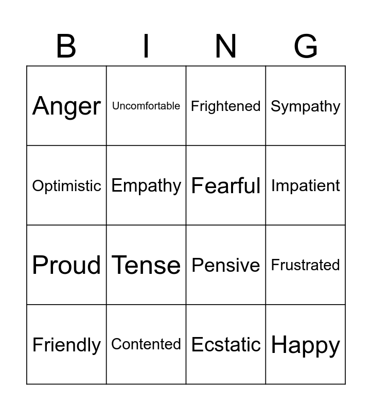 This bingo card has 54 words: Free!, Happy, Sad, Love, Autonomy, Peer Pressure, Sympathy, Laugh, Empathy, Feelings, Anger, Morals, Affectionate, Agreeable, Cheerful, Excited, Friendly, Proud, Loving, Ecstatic, Fantastic, Delighted, Contented, Optimistic, Actions, Uncomfortable, Tense, Anxious, Worried, Concerned, Timid, Uneasy, Alarmed, Scared, Frightened, Thoughtful, Pensive, Worried, Overwhelmed, Fearful, Peaceful, Quiet, Timid, Nervous, Calm, Embarrassed, Disappointed, Jealous, Impatient, Frustrated, Tense, Overwhelmed, Annoyed and Guilty.