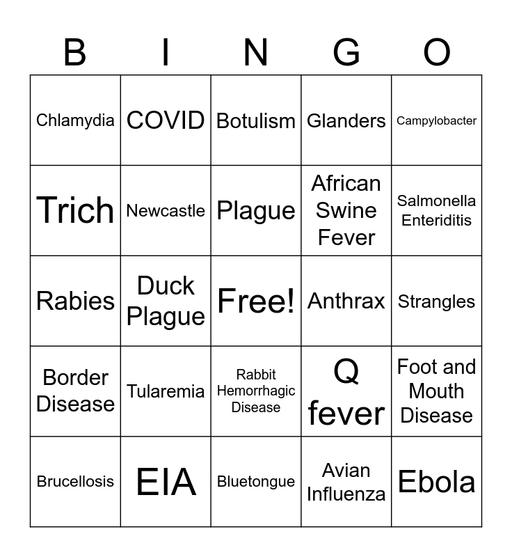 This bingo card has a free space and 24 words: Tularemia, EIA, Plague, Brucellosis, Campylobacter, Chlamydia, Trich, COVID, Anthrax, Rabbit Hemorrhagic Disease, African Swine Fever, Rabies, Q fever, Foot and Mouth Disease, Newcastle, Avian Influenza, Strangles, Botulism, Salmonella Enteriditis, Duck Plague, Ebola, Border Disease, Glanders and Bluetongue.