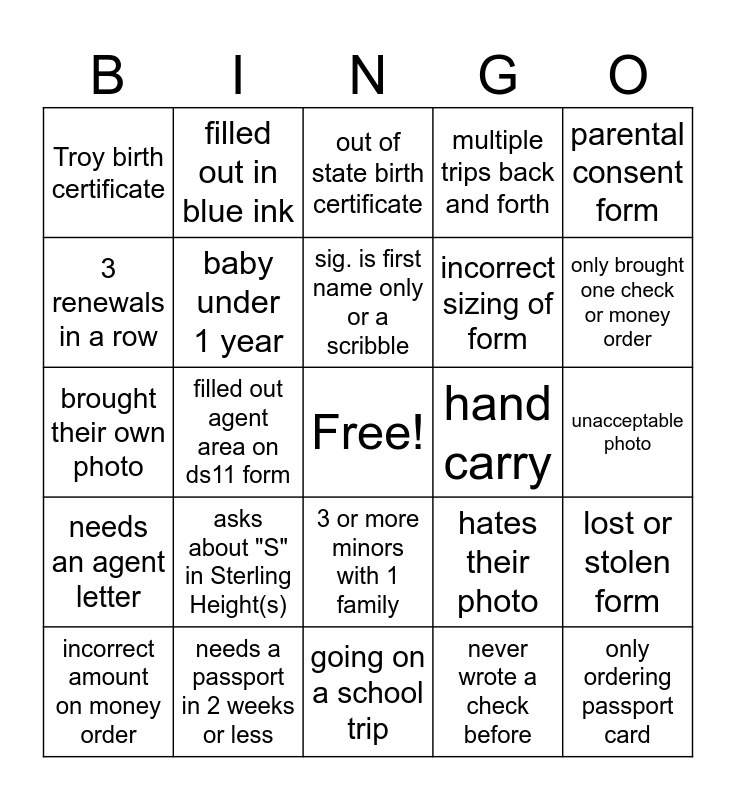 This bingo card has a free space and 24 words: asks about "S" in Sterling Height(s), needs a passport in 2 weeks or less, sig. is first name only or a scribble, incorrect amount on money order, parental consent form, Troy birth certificate, 3 renewals in a row, filled out in blue ink, hand carry, 3 or more minors with 1 family, incorrect sizing of form, brought their own photo, hates their photo, lost or stolen form, baby under 1 year, never wrote a check before, unacceptable photo, out of state birth certificate, only brought one check or money order, filled out agent area on ds11 form, only ordering passport card, needs an agent letter, multiple trips back and forth and going on a school trip.