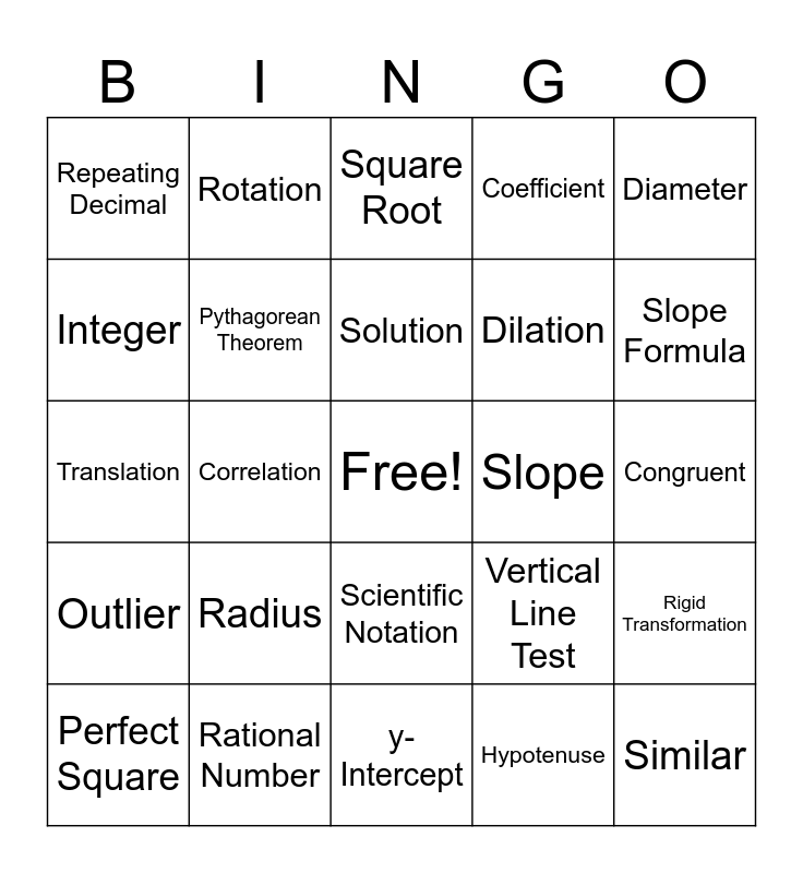 This bingo card has a free space and 30 words: Rational Number, Irrational Number, Correlation, Terminating Decimal, Repeating Decimal, Square Root, Pythagorean Theorem, Scientific Notation, Slope, y-Intercept, Congruent, Similar, Hypotenuse, Slope-Intercept Form, Slope Formula, Scale Factor, Vertical Line Test, Outlier, Radius, Diameter, Translation, Reflection, Rotation, Dilation, Integer, Coefficient, Rigid Transformation, Perfect Square, Solution and Line of Best Fit.