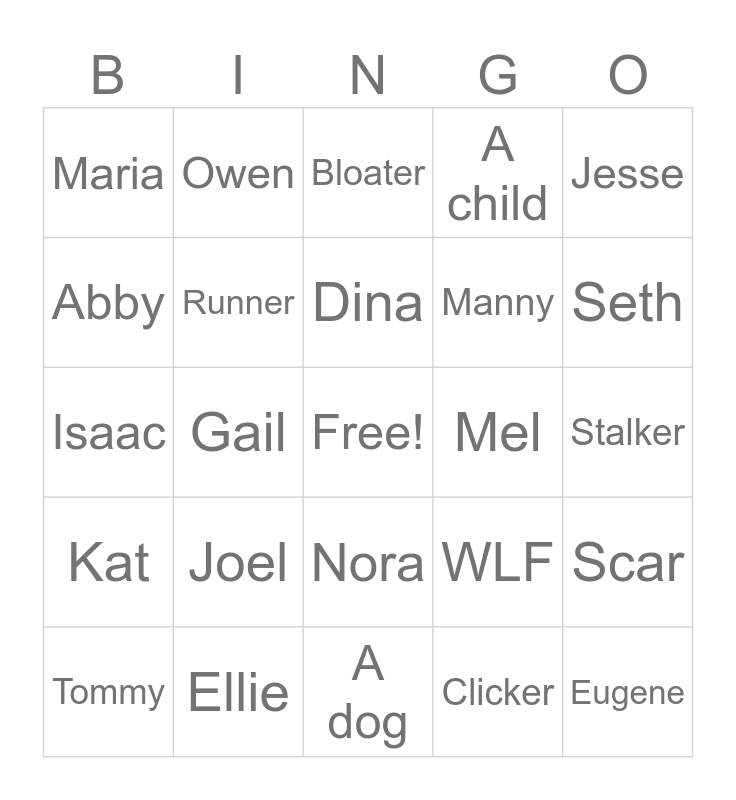 This bingo card has a free space and 24 words: Joel, Ellie, Dina, Tommy, Jesse, Maria, Abby, Owen, Mel, Nora, Manny, Isaac, WLF, Scar, Runner, Clicker, Stalker, Bloater, Seth, Gail, Eugene, Kat, A child and A dog.