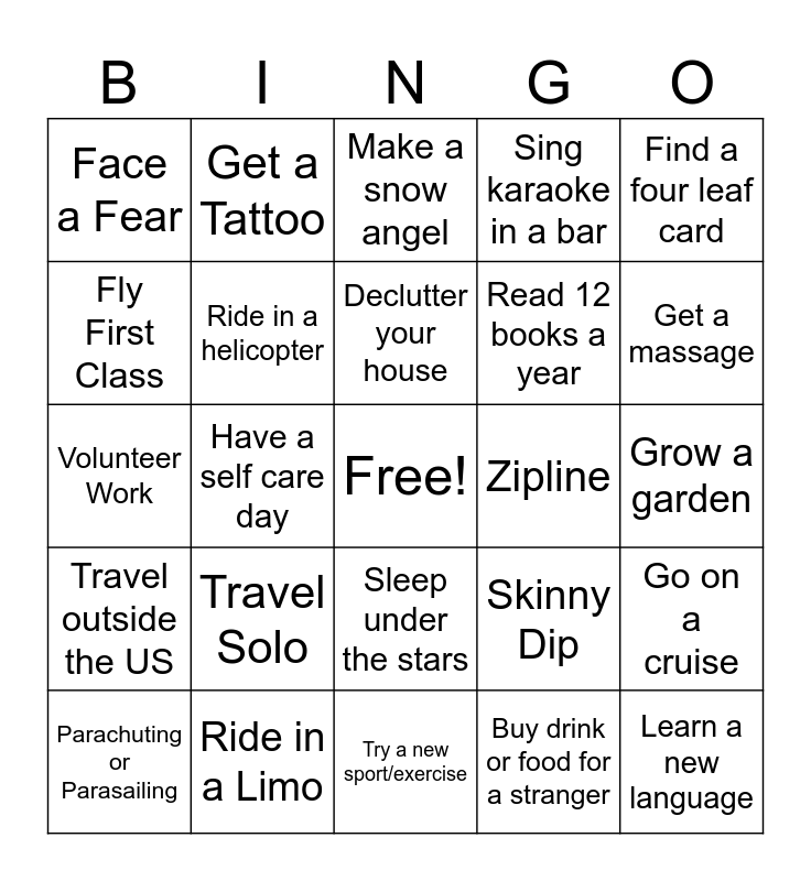 This bingo card has a free space and 24 words: Travel Solo, Ride in a Limo, Declutter your house, Parachuting or Parasailing, Find a four leaf card, Face a Fear, Fly First Class, Get a Tattoo, Zipline, Sleep under the stars, Read 12 books a year, Volunteer Work, Skinny Dip, Go on a cruise, Ride in a helicopter, Buy drink or food for a stranger, Grow a garden, Make a snow angel, Get a massage, Have a self care day, Learn a new language, Travel outside the US, Sing karaoke in a bar and Try a new sport/exercise.
