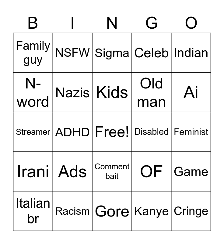 This bingo card has a free space and 24 words: Ads, Racism, Kids, Italian br, Indian, Family guy, N-word, NSFW, Disabled, Comment bait, Old man, Streamer, OF, Game, Nazis, Kanye, Feminist, Sigma, Ai, ADHD, Cringe, Irani, Celeb and Gore.