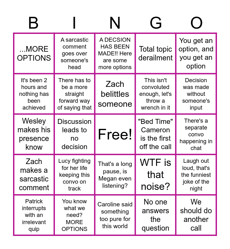 This bingo card has a free space and 25 words: Lucy fighting for her life keeping this convo on track, Caroline said something too pure for this world, Zach belittles someone, Patrick interrupts with an irrelevant quip, You get an option, and you get an option, ...MORE OPTIONS, It's been 2 hours and nothing has been achieved, A sarcastic comment goes over someone's head, "Bed Time" Cameron is the first off the call, That's a long pause, is Megan even listening?, This isn't convoluted enough, let's throw a wrench in it, Wesley makes his presence know, WTF is that noise?, Laugh out loud, that's the funniest joke of the night, There has to be a more straight forward way of saying that, Tangent o'clock, There's a separate convo happening in chat, A DECSION HAS BEEN MADE!! Here are some more options, Decision was made without someone's input, Discussion leads to no decision, We should do another call, You know what we need? MORE OPTIONS, Zach makes a sarcastic comment, Total topic derailment and No one answers the question.