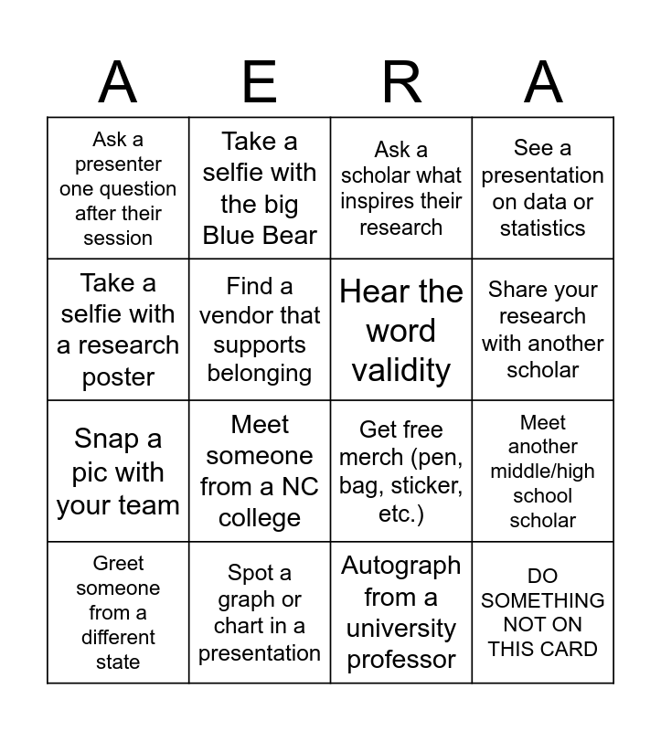 This bingo card has 17 words: Autograph from a university professor, Greet someone from a different state, Ask a scholar what inspires their research, Ask a presenter one question after their session, Meet someone from a NC college, See a presentation on data or statistics, Meet another middle/high school scholar, Hear the word validity, Share your research with another scholar, Find a vendor that supports belonging, Spot a graph or chart in a presentation, Get free merch (pen, bag, sticker, etc.), Take a selfie with a research poster, Take a selfie with the big Blue Bear, Snap a pic with your team, Snap a pic with a scholar and DO SOMETHING NOT ON THIS CARD.