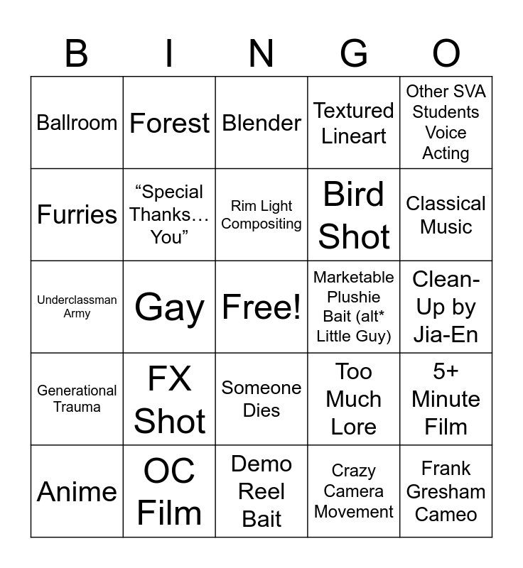 This bingo card has a free space and 30 words: OC Film, Robots, Gay, Aliens, Ballroom, Blender, “Special Thanks… You”, Someone Dies, Marketable Plushie Bait (alt* Little Guy), Demo Reel Bait, Clean-Up by Jia-En, Frank Gresham Cameo, Crazy Camera Movement, 360 Shot/Rotating Shot, Classical Music, Montage Sequence, Too Much Lore, Generational Trauma, FX Shot, Other SVA Students Voice Acting, Underclassman Army, Crowd Shot, Forest, Bird Shot, Furries, Textured Lineart, 5+ Minute Film, Anime, Rim Light Compositing and Excessive Whip Pans.