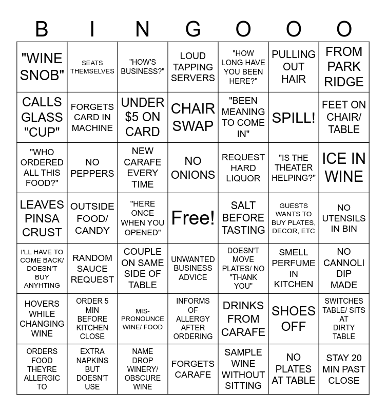 This bingo card has a free space and 48 words: DRINKS FROM CARAFE, SPILL!, FORGETS CARAFE, OUTSIDE FOOD/ CANDY, NEW CARAFE EVERY TIME, NO UTENSILS IN BIN, SEATS THEMSELVES, EXTRA NAPKINS BUT DOESN'T USE, PULLING OUT HAIR, UNWANTED BUSINESS ADVICE, FROM PARK RIDGE, LOUD TAPPING SERVERS, "IS THE THEATER HELPING?", REQUEST HARD LIQUOR, HOVERS WHILE CHANGING WINE, GUESTS WANTS TO BUY PLATES, DECOR, ETC, CALLS GLASS "CUP", FEET ON CHAIR/ TABLE, SHOES OFF, "HOW LONG HAVE YOU BEEN HERE?", "BEEN MEANING TO COME IN", "HERE ONCE WHEN YOU OPENED", "WINE SNOB", FORGETS CARD IN MACHINE, SWITCHES TABLE/ SITS AT DIRTY TABLE, UNDER $5 ON CARD, ICE IN WINE, ORDERS FOOD THEYRE ALLERGIC TO, NO ONIONS, NO PEPPERS, NO PLATES AT TABLE, SALT BEFORE TASTING, NO CANNOLI DIP MADE, ORDER 5 MIN BEFORE KITCHEN CLOSE, LEAVES PINSA CRUST, DOESN'T MOVE PLATES/ NO "THANK YOU", SMELL PERFUME IN KITCHEN, "WHO ORDERED ALL THIS FOOD?", COUPLE ON SAME SIDE OF TABLE, MIS-PRONOUNCE WINE/ FOOD, I'LL HAVE TO COME BACK/ DOESN'T BUY ANYHTING, STAY 20 MIN PAST CLOSE, "HOW'S BUSINESS?", NAME DROP WINERY/ OBSCURE WINE, CHAIR SWAP, INFORMS OF ALLERGY AFTER ORDERING, RANDOM SAUCE REQUEST and SAMPLE WINE WITHOUT SITTING.