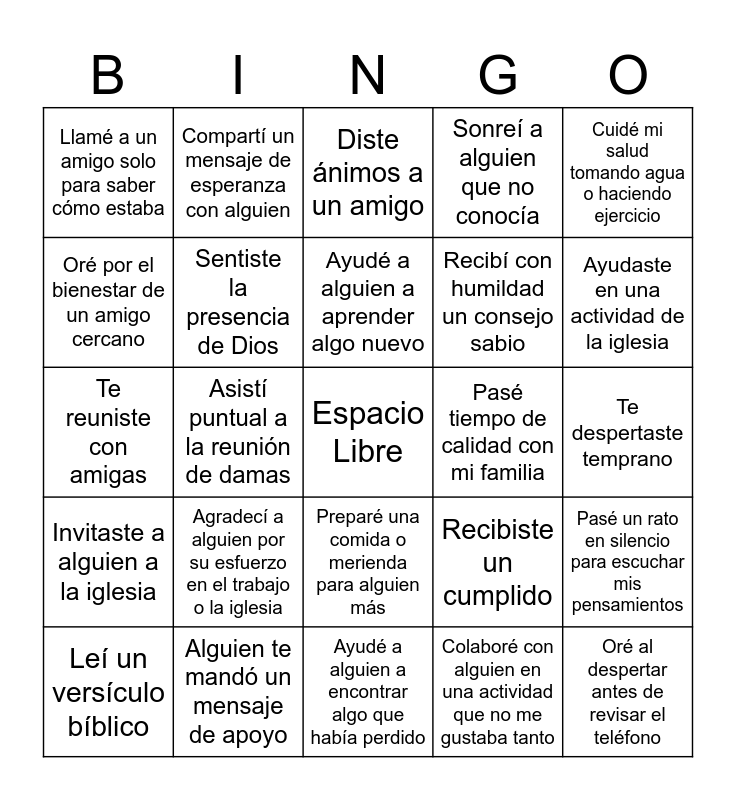 This bingo card has a free space and 29 words: Leí un versículo bíblico, Invitaste a un vecino desconocido a la iglesia, Asistí puntual a la reunión de damas, Cantaste un himno, Llamé a un amigo solo para saber cómo estaba, Diste ánimos a un amigo, Sentiste la presencia de Dios, Agradecí a alguien por su esfuerzo en el trabajo o la iglesia, Pasé tiempo de calidad con mi familia, Alguien te mandó un mensaje de apoyo, Te despertaste temprano, Oré al despertar antes de revisar el teléfono, Ayudé a alguien a encontrar algo que había perdido, Colaboré con alguien en una actividad que no me gustaba tanto, Ayudaste en una actividad de la iglesia, Leí un devocional y me inspiró, Preparé una comida o merienda para alguien más, Invitaste a alguien a la iglesia, Cuidé mi salud tomando agua o haciendo ejercicio, Te reuniste con amigas, Recibiste un cumplido, Recordé orar por alguien que está pasando por un momento difícil, Recibí con humildad un consejo sabio, Oré por el bienestar de un amigo cercano, Sonreí a alguien que no conocía, Compartí un mensaje de esperanza con alguien, Pasé un rato en silencio para escuchar mis pensamientos, Ayudé a alguien a aprender algo nuevo and Fui paciente cuando una situación me frustraba.