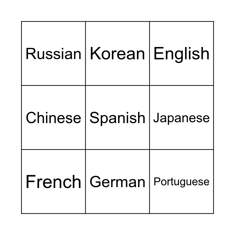 This bingo card has 10 words: French, Korean, English, Chinese, Spanish, Portuguese, Russian, German, Japanese and Italian.