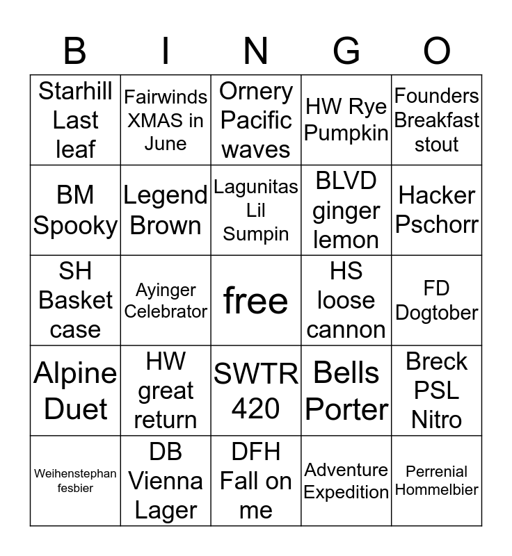This bingo card has a free space and 24 words: HW great return, DB Vienna Lager, Lagunitas Lil Sumpin, Weihenstephan fesbier, Founders Breakfast stout, Starhill Last leaf, BM Spooky, Fairwinds XMAS in June, HS loose cannon, SWTR 420, BLVD ginger lemon, SH Basket case, Bells Porter, Breck PSL Nitro, Legend Brown, Adventure Expedition, FD Dogtober, Ornery Pacific waves, Hacker Pschorr, Ayinger Celebrator, Perrenial Hommelbier, Alpine Duet, HW Rye Pumpkin and DFH Fall on me.