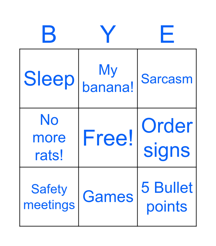This bingo card has a free space and 16 words: Retirement, Cruise, Sarcasm, Sleep, Casino, My banana!, Countdown, Tacos, 5 Bullet points, Order signs, Monhtlys, No more rats!, No more drama!, Games, Safety meetings and Return Box Cutter.