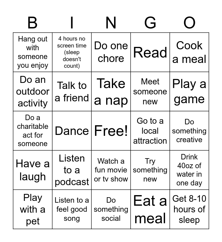 This bingo card has a free space and 29 words: Have a well deserved drink, Listen to a feel good song, Do one chore, Take a fitness class, Cook a meal, Hang out with someone you enjoy, Talk to a friend, Take a nap, Go to a local attraction, Drink 40oz of water in one day, Play with a pet, Dance, Eat a meal, Get 8-10 hours of sleep, Do a charitable act for someone, Exercise for 30 minutes, Do something social, Try something new, Play a game, Have a laugh, Listen to a podcast, Make someone smile, Meet someone new, Do something creative, Do an outdoor activity, 4 hours no screen time (sleep doesn't count), Watch a fun movie or tv show, Read and Encourage someone else to do something on this list.