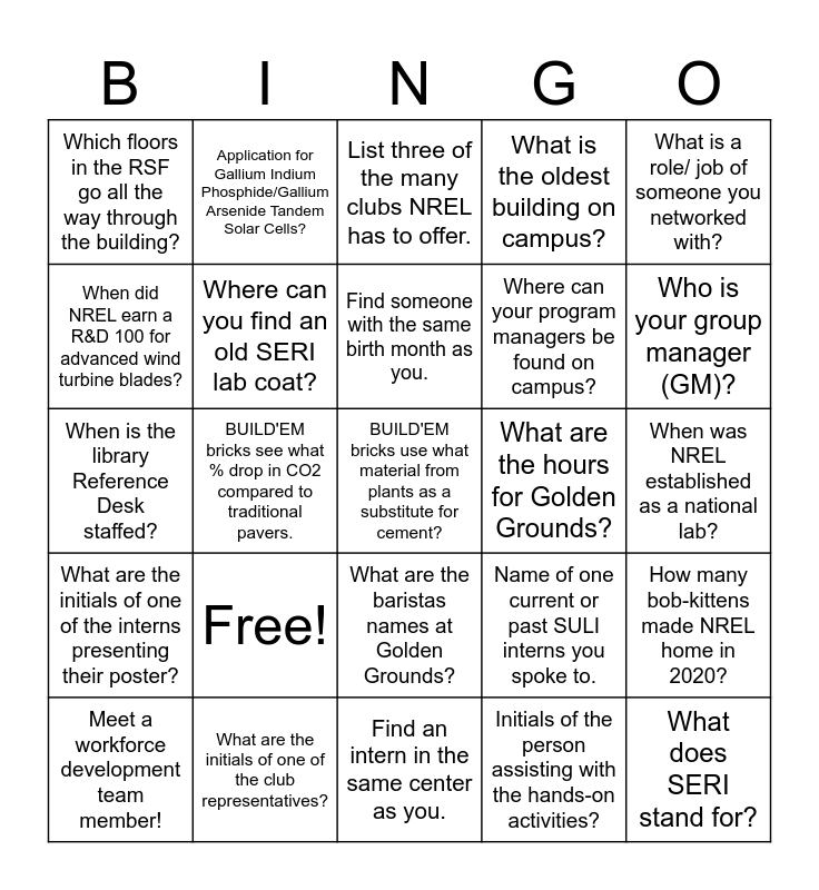 This bingo card has 25 words: Free!, Find an intern in the same center as you., Find someone with the same birth month as you., Meet a workforce development team member!, What is a role/ job of someone you networked with?, Which floors in the RSF go all the way through the building?, When did NREL earn a R&D 100 for advanced wind turbine blades?, Application for Gallium Indium Phosphide/Gallium Arsenide Tandem Solar Cells?, What are the hours for Golden Grounds?, What are the baristas names at Golden Grounds?, Where can your program managers be found on campus?, When is the library Reference Desk staffed?, Name of one current or past SULI interns you spoke to., How many bob-kittens made NREL home in 2020?, Where can you find an old SERI lab coat?, What does SERI stand for?, When was NREL established as a national lab?, List three of the many clubs NREL has to offer., Who is your group manager (GM)?, BUILD'EM bricks see what % drop in CO2 compared to traditional pavers., BUILD'EM bricks use what material from plants as a substitute for cement?, What are the initials of one of the club representatives?, What are the initials of one of the interns presenting their poster?, What is the oldest building on campus? and Initials of the person assisting with the hands-on activities?.