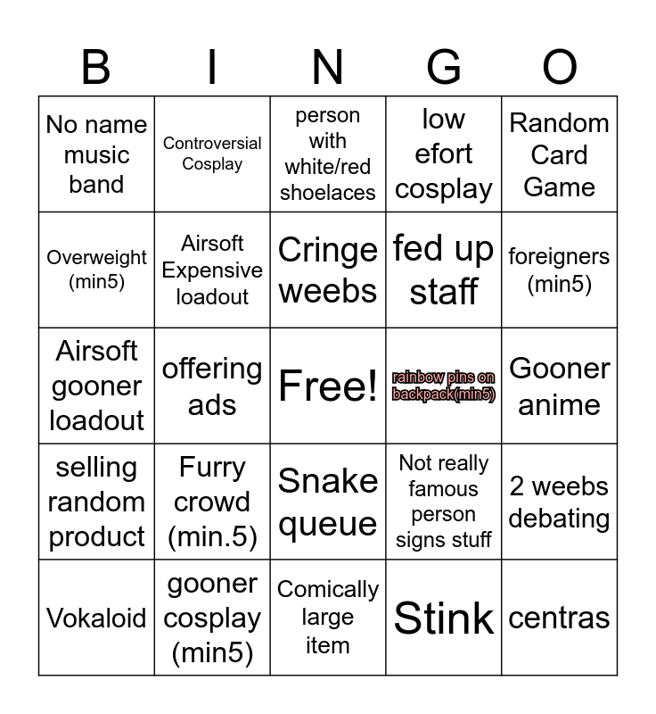 This bingo card has a free space and 24 words: Vokaloid, Furry crowd (min.5), Cringe weebs, Stink, Random Card Game, No name music band, Controversial Cosplay, person with white/red shoelaces, rainbow pins on backpack(min5), Gooner anime, Airsoft gooner loadout, Airsoft Expensive loadout, Not really famous person signs stuff, 2 weebs debating, Overweight (min5), gooner cosplay (min5), Comically large item, low efort cosplay, foreigners (min5), selling random product, offering ads, Snake queue, fed up staff and centras.
