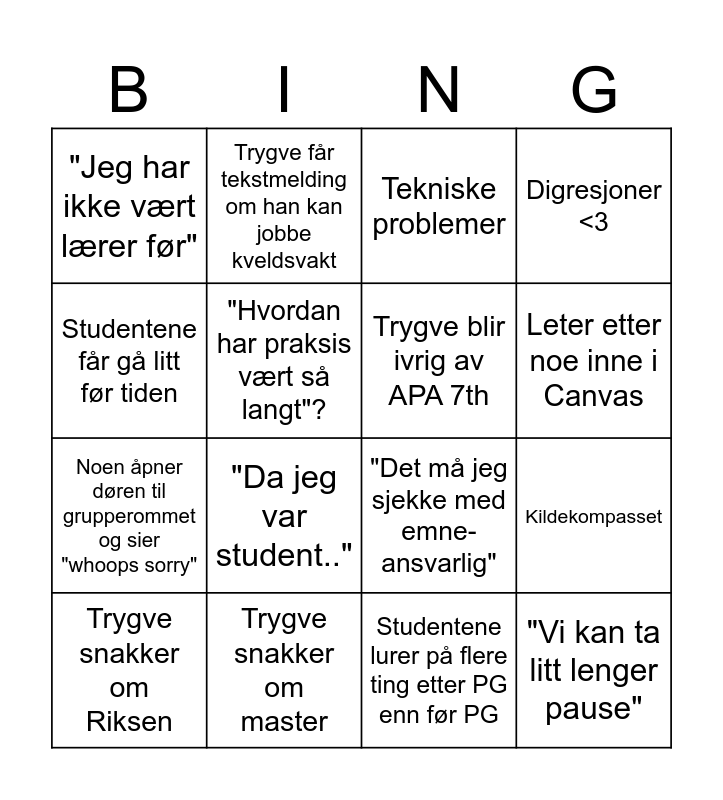 This bingo card has 16 words: Trygve snakker om master, Kildekompasset, Tekniske problemer, "Jeg har ikke vært lærer før", Noen åpner døren til grupperommet og sier "whoops sorry", Trygve får tekstmelding om han kan jobbe kveldsvakt, "Det må jeg sjekke med emne-ansvarlig", Studentene lurer på flere ting etter PG enn før PG, Studentene får gå litt før tiden, "Hvordan har praksis vært så langt"?, Trygve snakker om Riksen, Digresjoner <3, "Da jeg var student..", Leter etter noe inne i Canvas, Trygve blir ivrig av APA 7th and "Vi kan ta litt lenger pause".