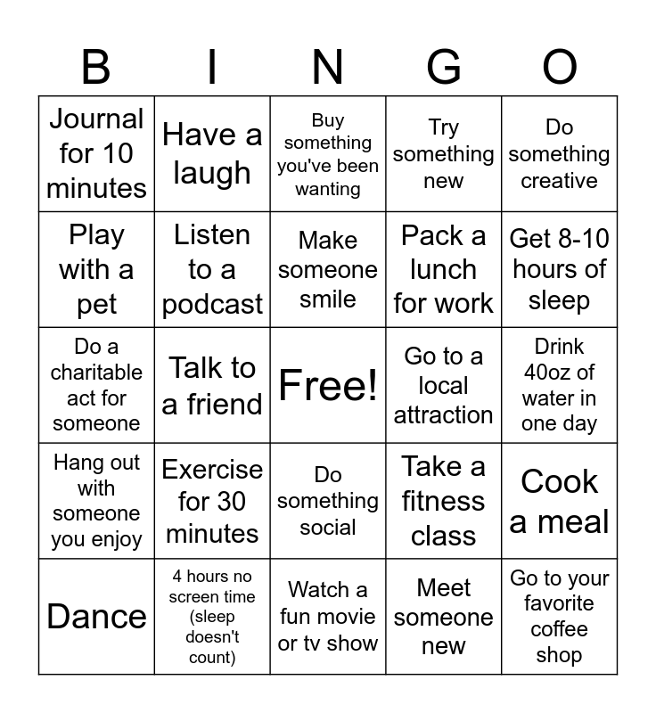 This bingo card has a free space and 39 words: Have a well deserved drink, Listen to a feel good song, Do one chore, Take a fitness class, Cook a meal, Hang out with someone you enjoy, Talk to a friend, Take a nap, Go to a local attraction, Drink 40oz of water in one day, Play with a pet, Have a laugh, Eat a meal, Get 8-10 hours of sleep, Do a charitable act for someone, Exercise for 30 minutes, Do something social, Try something new, Play a game, Dance, Listen to a podcast, Make someone smile, Meet someone new, Do something creative, Do an outdoor activity, 4 hours no screen time (sleep doesn't count), Watch a fun movie or tv show, Touch some grass, Encourage someone else to do something on this list, Journal for 10 minutes, Do self care two days in a row, Have a sweet treat, Pack a lunch for work, Go to your favorite coffee shop, Wear your favorite outfit, Read, Buy something you've been wanting, Remember a fond memory and Write a coworker an applause.