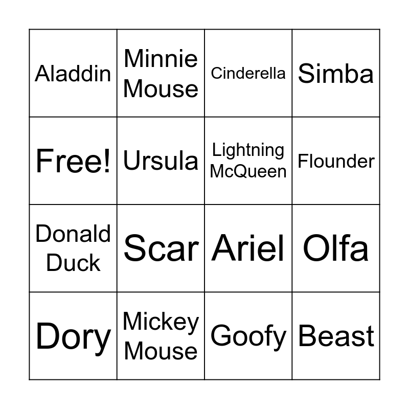 This bingo card has 16 words: Mickey Mouse, Olfa, Cinderella, Aladdin, Donald Duck, Minnie Mouse, Ariel, Goofy, Free!, Ursula, Dory, Simba, Scar, Flounder, Lightning McQueen and Beast.