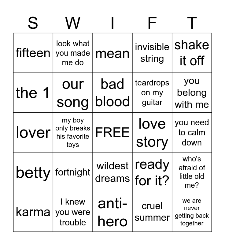 This bingo card has a free space and 34 words: red, cruel summer, cardigan, I can do it with a broken heart, betty, our song, shake it off, karma, look what you made me do, 22, bad blood, mean, me!, august, love story, you belong with me, I knew you were trouble, lover, fortnight, ready for it?, wildest dreams, blank space, fifteen, you need to calm down, anti-hero, we are never getting back together, invisible string, willow, teardrops on my guitar, the 1, the man, my boy only breaks his favorite toys, who's afraid of little old me? and delicate.