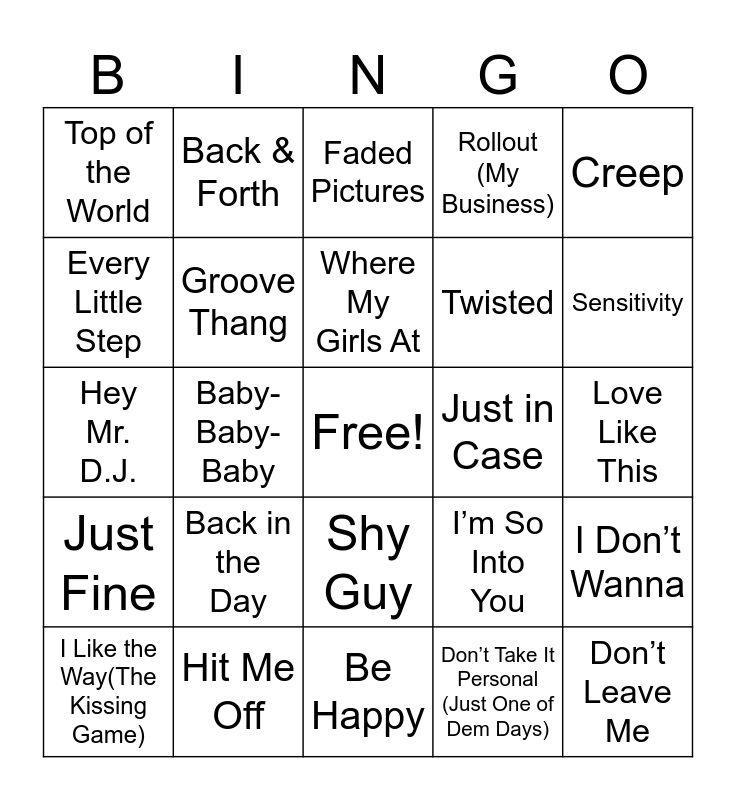 This bingo card has a free space and 36 words: You Make Me Wanna…, Every Little Thing I Do, Candy, Groove Thang, I’m So Into You, Just Fine, Where My Girls At, Don’t Walk Away, Creep, Nite And Day, Baby- Baby- Baby, Rollout (My Business), Sending My Love, Just in Case, Sensitivity, Top of the World, Hey Ya!, Back in the Day, Don’t Leave Me, Faded Pictures, Love Like This, I Don’t Wanna, Hit Me Off, I Like the Way(The Kissing Game), Be Happy, Back & Forth, Hey Mr. D.J., Candy Rain, Twisted, Every Little Step, Right Here, Real Love, Don’t Take It Personal (Just One of Dem Days), Shy Guy, Tell Me and Rock The Boat.