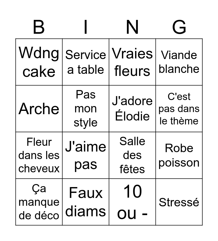 This bingo card has 16 words: Faux diams, Robe poisson, Vraies fleurs, Wdng cake, Fleur dans les cheveux, Service a table, Salle des fêtes, 10 ou -, Arche, Pas mon style, Ça manque de déco, Viande blanche, J'aime pas, C'est pas dans le thème, J'adore Élodie and Stressé.