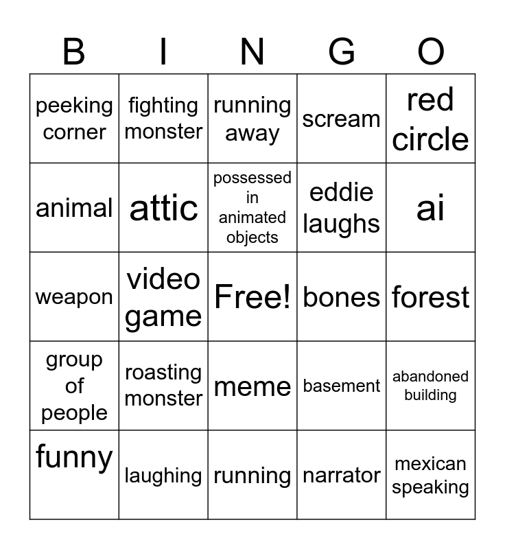 This bingo card has a free space and 24 words: funny, roasting monster, possessed in animated objects, narrator, red circle, peeking corner, fighting monster, running away, bones, forest, weapon, attic, basement, abandoned building, animal, laughing, running, scream, ai, group of people, video game, meme, eddie laughs and mexican speaking.