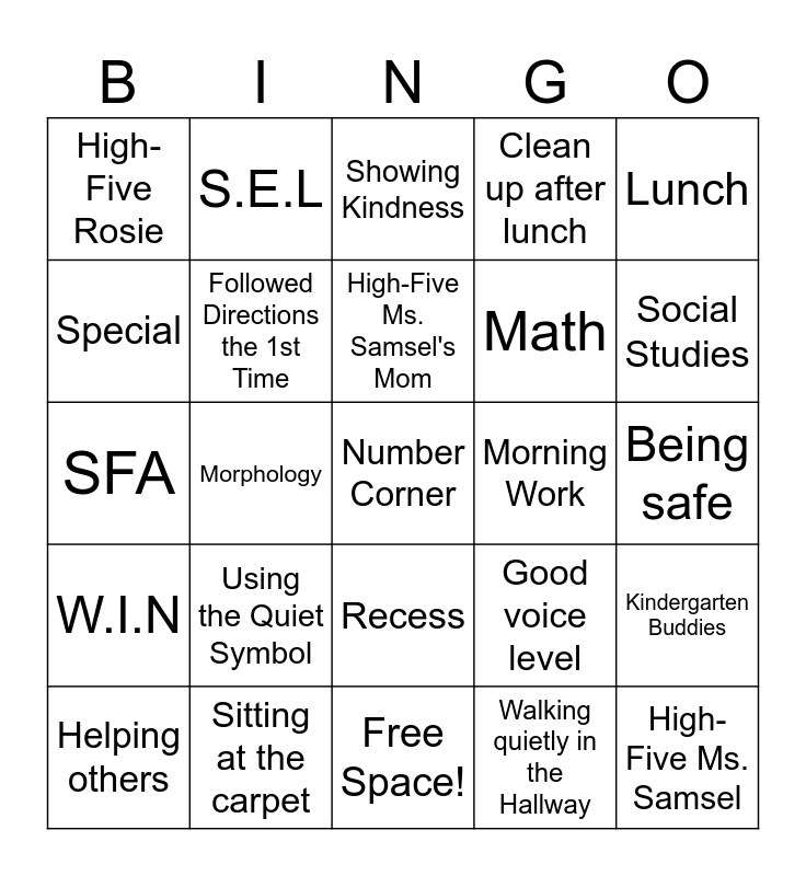 This bingo card has 25 words: W.I.N, Sitting at the carpet, Number Corner, Walking quietly in the Hallway, Lunch, High-Five Rosie, S.E.L, Showing Kindness, Morning Work, Kindergarten Buddies, Special, Followed Directions the 1st Time, Free Space!, Good voice level, Social Studies, Helping others, Morphology, High-Five Ms. Samsel's Mom, Math, Being safe, SFA, Using the Quiet Symbol, Recess, Clean up after lunch and High-Five Ms. Samsel.