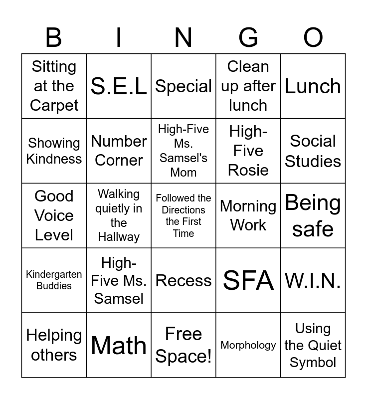 This bingo card has 25 words: Kindergarten Buddies, Math, Followed the Directions the First Time, Morphology, Lunch, Sitting at the Carpet, S.E.L, Special, Morning Work, W.I.N., Showing Kindness, Number Corner, Free Space!, SFA, Social Studies, Helping others, Walking quietly in the Hallway, High-Five Ms. Samsel's Mom, High-Five Rosie, Being safe, Good Voice Level, High-Five Ms. Samsel, Recess, Clean up after lunch and Using the Quiet Symbol.
