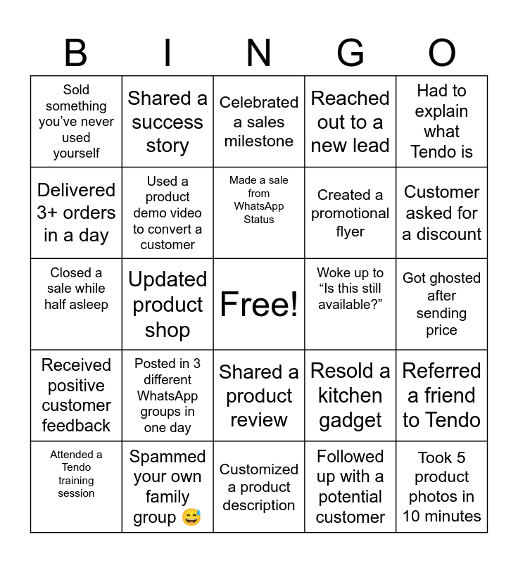 This bingo card has a free space and 24 words: Posted in 3 different WhatsApp groups in one day, Spammed your own family group 😅, Made a sale from WhatsApp Status, Attended a Tendo training session, Had to explain what Tendo is, Sold something you’ve never used yourself, Delivered 3+ orders in a day, Shared a success story, Woke up to “Is this still available?”, Shared a product review, Created a promotional flyer, Closed a sale while half asleep, Resold a kitchen gadget, Referred a friend to Tendo, Used a product demo video to convert a customer, Followed up with a potential customer, Got ghosted after sending price, Celebrated a sales milestone, Customer asked for a discount, Updated product shop, Took 5 product photos in 10 minutes, Received positive customer feedback, Reached out to a new lead and Customized a product description.