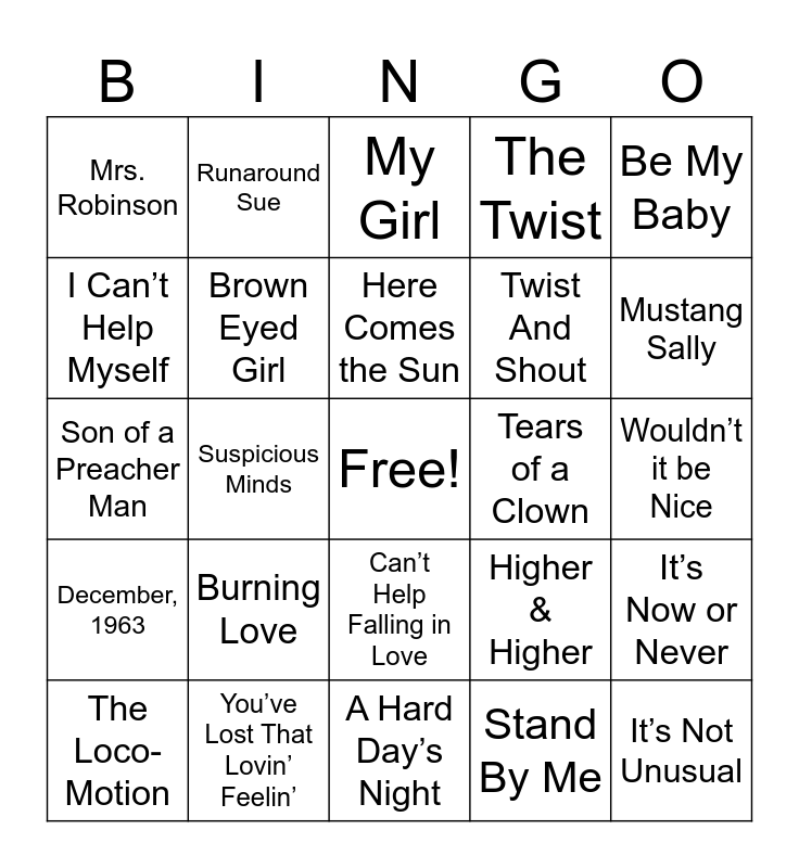 This bingo card has a free space and 40 words: Stuck on You, Son of a Preacher Man, Oh, Pretty Woman, Brown Eyed Girl, You’ve Lost That Lovin’ Feelin’, Can’t Help Falling in Love, Here Comes the Sun, When a Man Loves a Woman, Be My Baby, December, 1963, Suspicious Minds, The Twist, It’s Not Unusual, Wouldn’t it be Nice, Tears of a Clown, Burning Love, Sugar Sugar, Mrs. Robinson, Good Vibrations, My Girl, It’s Now or Never, Stand By Me, Twist And Shout, I Can’t Help Myself, You Can’t Hurry Love, Viva Las Vegas, Can’t Take My Eyes Off You, Dancing in the Street, I Got You Babe, Do Wah Diddy Diddy, Gimme Some Lovin’, The Loco-Motion, Do You Love Me?, Higher & Higher, Mustang Sally, A Hard Day’s Night, Respect, I Get Around, Runaround Sue and Under the Boardwalk.