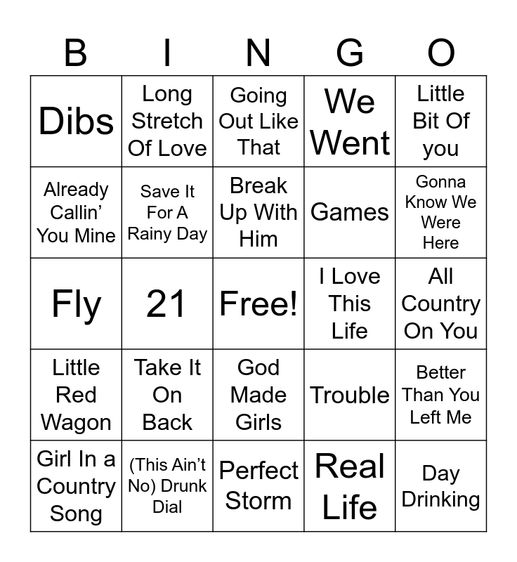This bingo card has a free space and 69 words: Southern Style, All Country On You, Drunk Americans, That Don’t Sound Like You, (This Ain’t No) Drunk Dial, Country, We Went, Trailer Hitch, Little Bit Of you, Lay Low, Better Than You Left Me, Freestyle, Dibs, Going Out Like That, Hard To Be Cool, 21, God Made Girls, Games, Kiss You Tonight, Little Red Wagon, I Love This Life, Trouble, Gonna Know We Were Here, Top Of The World, Riot, Feelin It, Look At You, I Got The Boy, Real Life, Gonna, Long Stretch Of Love, Smoke Break, What We Ain’t Got, Burning House, Stay A Little Longer, She Don’t Love You, I’m Comin’ Over, Strip It Down, Already Callin’ You Mine, I’m To Blame, Take It On Back, Day Drinking, Sunshine & Whiskey, Run Away With You, Close Your Eyes, Girl In a Country Song, Like A Wrecking Ball, Anything Goes, Kick Up The Dust, Save It For A Rainy Day, Break Up With Him, Nothin’ Like You, John Cougar, John Deer, John 3:16, Perfect Storm, Let Me See Ya Girl, Loving You Easy, Crushing’ It, Something In The Water, Diamond Rings and Old Barstools, Fly, Wild Child, Buy Me A Boat, Somewhere In My Car, Like A Cowboy, House Party, Girl Crush, Little Toy Guns, Crash And Burn and Gonna Wanna Tonight.