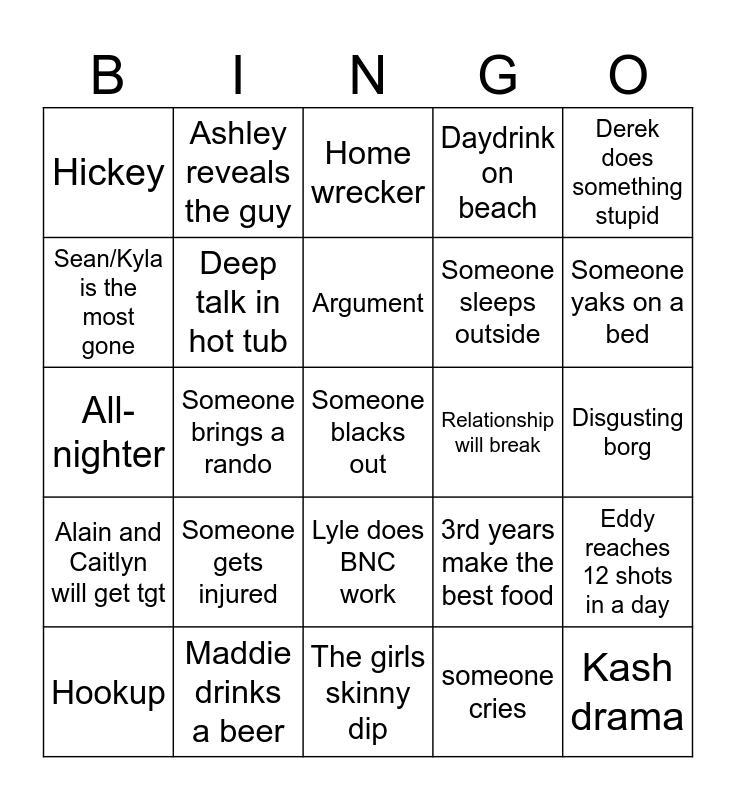 This bingo card has a free space and 24 words: Someone gets injured, Maddie drinks a beer, Argument, Hookup, Derek does something stupid, Hickey, Sean/Kyla is the most gone, Ashley reveals the guy, Relationship will break, Lyle does BNC work, Someone sleeps outside, All-nighter, 3rd years make the best food, Eddy reaches 12 shots in a day, Deep talk in hot tub, someone cries, Disgusting borg, Home wrecker, Someone yaks on a bed, Someone brings a rando, Kash drama, Alain and Caitlyn will get tgt, Daydrink on beach and The girls skinny dip.