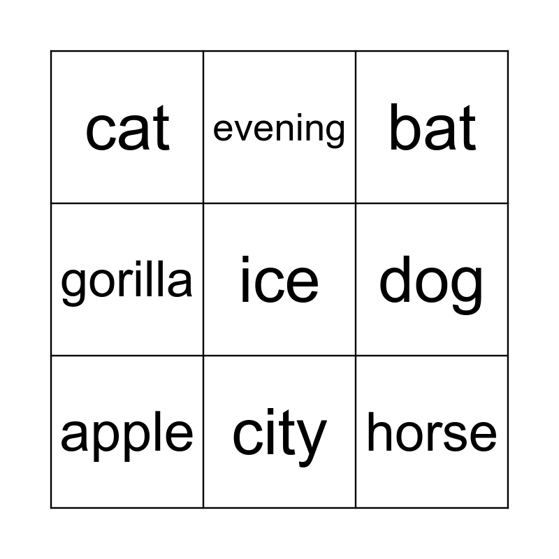 This bingo card has 18 words: apple, apron, bat, cat, city, dog, egg, evening, flower, gorilla, gym, horse, ink, ice, jump, koala, log and monkey.