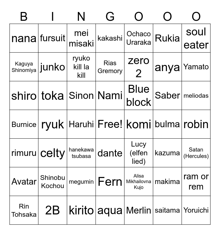 This bingo card has a free space and 131 words: frieren, fursuit, Fern, yor, sakamoto, bakugo, toka, android 18, komi, kirito, eren, marin, ram or rem, Mai Sakurajima, nezuko, Haikyu!!, Haruhi, chainsaw man, sailor moon, misa, bulma, anya, junko, todoroki, C.C, robin, zero 2, makima, Mitsuri Kanroji, pikachu, kakashi, Saber, ryuko kill la kill, Yoruichi, Mikasa, Power, Erza, momo ayase, Asuna, Holo, Kaguya Shinomiya, Kurumi Tokisaki, Taiga Aisaka, Astolfo, Albedo, rudeus, Tamaki, dante, vergil, 2B, kaneki, saitama, Ai Hoshino, violet evergarden, Gojo, saber, yuno gasai, Nazuna Nanakusa, delta, Burnice, Maomao, rimuru, Takina Inoue, Chisato Nishikigi, Nanami, kazuma, Quintupletes, Cha Hae-In, Rias Gremory, Akeno Himejima, Nami, gotou, Alisa Mikhailovna Kujo, Esdeath, K-ON, Elizabeth Liones, Yumeko Jabami, Lucy (elfen lied), Erina Nakiri, Rin Tohsaka, Mirajane, Boa Hancock, nana, Sinon, kenshin, Akane Kurokawa, Yamato, Orihime Inoue, ryuk, zenitsu, Nobara Kugisaki, Hestia, Merlin, Neliel Tu Oderschwank, aqua, hanekawa tsubasa, Ochaco Uraraka, Milim Nava, Rukia, Shinoa Hiiragi, Avatar, mei misaki, dr stone, cyberpunk, celty, Mai Valentine, shiro, echidna, meliodas, escanor, soul eater, anos, hestia, Dio, megumin, Fire Force, uta, tokyo revengers, yui(angel beats), Satan (Hercules), Baki, Gundam, tatsu, felix, Shinobu Kochou, akatsuki, Blue block, Kaijuu, alucard, quintuplets and Mashle.