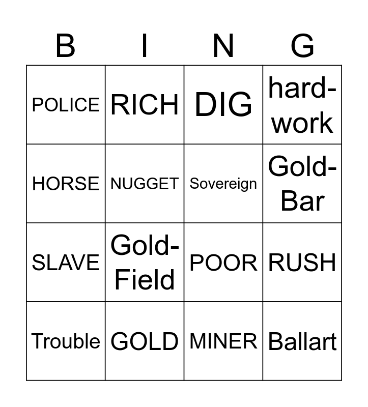 This bingo card has 16 words: GOLD, RUSH, DIG, POLICE, SLAVE, RICH, POOR, MINER, HORSE, NUGGET, Trouble, hard-work, Gold-Field, Gold-Bar, Sovereign and Ballart.