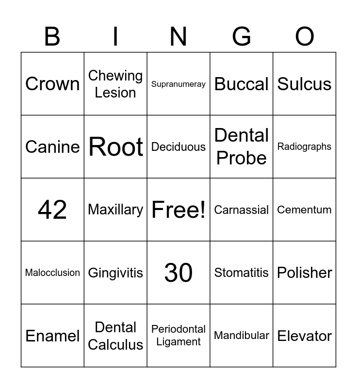 This bingo card has a free space and 32 words: Mandibular, Pulp, Maxillary, Attrition, Malocclusion, Root, Sulcus, Polisher, Chewing Lesion, Abrasion, Deciduous, Supranumeray, Parallel Technique, Lingual, Carnassial, Dentin, Enamel, 42, 30, Gingivitis, Stomatitis, Resorptive Lesion, Cementum, Dental Calculus, Elevator, Buccal, Dental Probe, Canine, Crown, Periodontal Ligament, Brachycephalic and Radiographs.