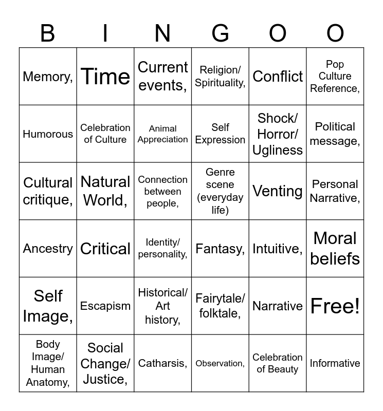 This bingo card has 38 words: Free!, Narrative, Informative, Humorous, Critical, Venting, Celebration of Culture, Celebration of Beauty, Conflict, Animal Appreciation, Political message,, Religion/ Spirituality,, Cultural critique,, Connection between people,, Pop Culture Reference,, Genre scene (everyday life), Historical/ Art history,, Current events,, Social Change/ Justice,, Natural World,, Memory,, Fantasy,, Self Expression, Identity/ personality,, Catharsis,, Intuitive,, Self Image,, Observation,, Body Image/ Human Anatomy,, Fairytale/ folktale,, Emotional/ Mental Health, Personal Narrative,, Moral beliefs, Time, Escapism, Ancestry, Shock/ Horror/ Ugliness and Surrealism.