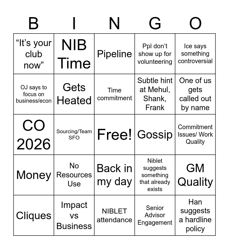 This bingo card has a free space and 29 words: Cliques, Exec Glaze, Sourcing/Team SFO, Not Locked In, “It’s your club now”, Pipeline, Gets Heated, No Resources Use, Gossip, Impact vs Business, Commitment Issues/ Work Quality, Han suggests a hardline policy, NIBLET attendance, Senior Advisor Engagement, One of us gets called out by name, Women Voices, Back in my day, Money, Ice says something controversial, CO 2026, Niblet suggests something that already exists, Ethan says no one shows up, Subtle hint at Mehul, Shank, Frank, OJ says to focus on business/econ, Ppl don’t show up for volunteering, NIB Time, GM Quality, Time commitment and Cross club/team.