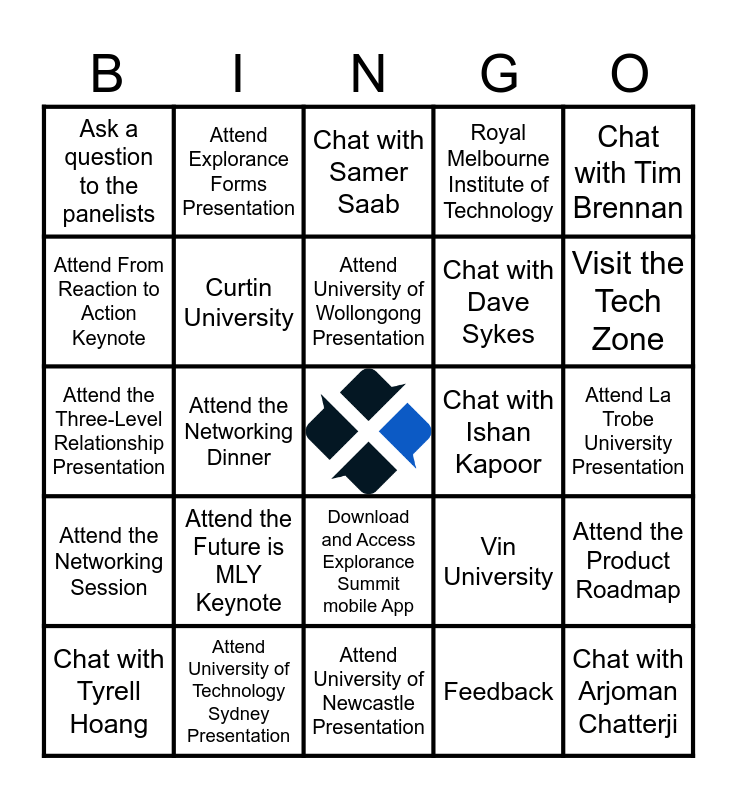 This bingo card has a free space and 24 words: Chat with Tyrell Hoang, Attend the Future is MLY Keynote, Attend University of Wollongong Presentation, Feedback, Chat with Tim Brennan, Ask a question to the panelists, Attend Explorance Forms Presentation, Chat with Samer Saab, Chat with Ishan Kapoor, Attend La Trobe University Presentation, Attend the Three-Level Relationship Presentation, Curtin University, Vin University, Attend the Product Roadmap, Attend From Reaction to Action Keynote, Attend University of Technology Sydney Presentation, Attend University of Newcastle Presentation, Royal Melbourne Institute of Technology, Visit the Tech Zone, Attend the Networking Session, Attend the Networking Dinner, Download and Access Explorance Summit mobile App, Chat with Dave Sykes and Chat with Arjoman Chatterji.