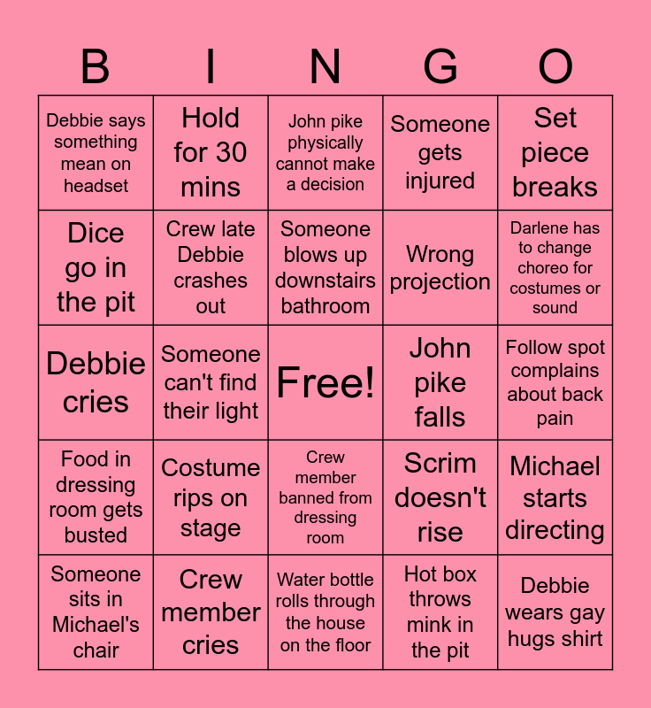 This bingo card has a free space and 24 words: Costume rips on stage, Crew member cries, Someone blows up downstairs bathroom, Someone sits in Michael's chair, Set piece breaks, Debbie says something mean on headset, Dice go in the pit, Hold for 30 mins, John pike falls, Crew member banned from dressing room, Wrong projection, Debbie cries, Scrim doesn't rise, Michael starts directing, Crew late Debbie crashes out, Hot box throws mink in the pit, Follow spot complains about back pain, John pike physically cannot make a decision, Darlene has to change choreo for costumes or sound, Someone can't find their light, Debbie wears gay hugs shirt, Food in dressing room gets busted, Someone gets injured and Water bottle rolls through the house on the floor.
