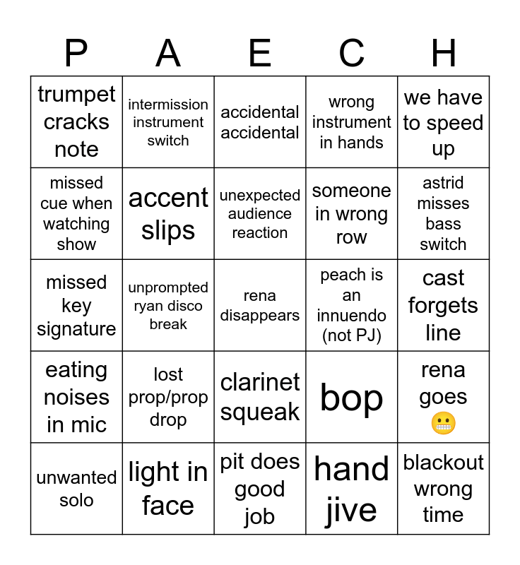 This bingo card has 30 words: light in face, pit discovers new plot, unprompted ryan disco break, pit jam, trumpet cracks note, accidental accidental, accent slips, clarinet squeak, peach is an innuendo (not PJ), pit does good job, cast forgets line, rena disappears, hand jive, blackout wrong time, astrid misses bass switch, plump and juicy not scary, bop, eating noises in mic, lost prop/prop drop, we have to speed up, missed key signature, doesnβt catch thrown peach, intermission instrument switch, someone in wrong row, missed cue when watching show, wrong instrument in hands, rena goes π¬, unwanted solo, unexpected audience reaction and miss cut time change.